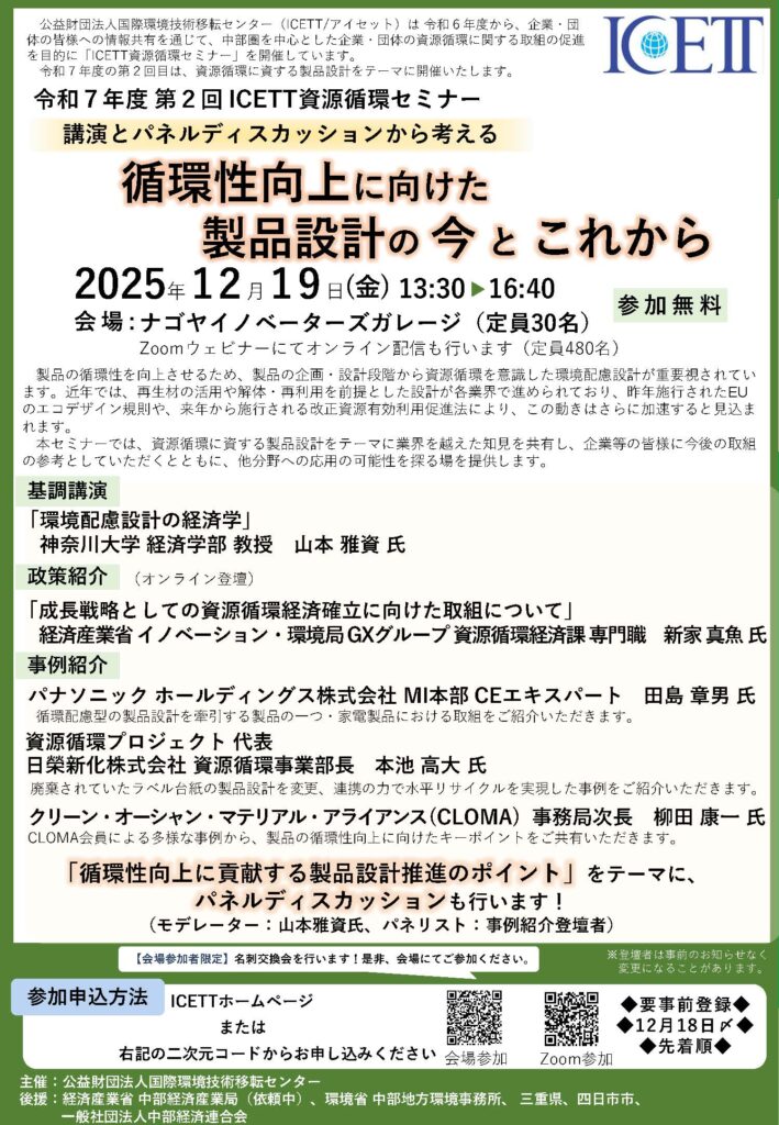 公益財団法人国際環境技術移転センター(ICETT/アイセット)は、2024年度より企業・団体の皆様への情報共有を通じて、中部圏を中心とした企業・団体の資源循環に関する取組の促進を目的に「ICETT資源循環セミナー」を開催しています。